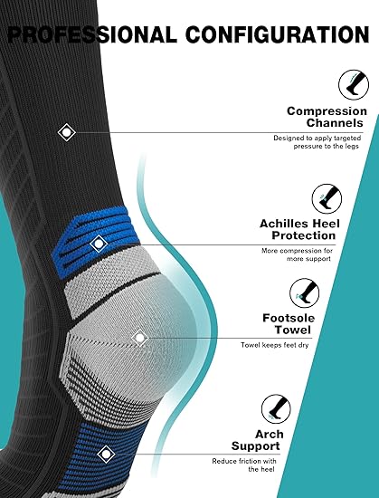 - Achilles Protection: The socks offer superior Achilles protection, reducing heel friction. The footsole towel protection system wicks away sweat, keeping feet dry and minimizing slipping.